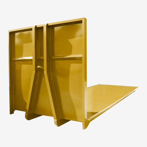 Sistema de Carga: Equipo de gancho Espesor de Chapa:4 mm en S235JR Guías de: IPN 180 Tipo de Soldadura: Soldadura a cordón continuo Imprimación: 2 capas imprimación secado rápido Pintura: Esmalte sintético – Ral a confirmar Rodillos arrastre: Metálicos de ø200 mm Personalización: No incluida Tara Aproximada: 1690kg